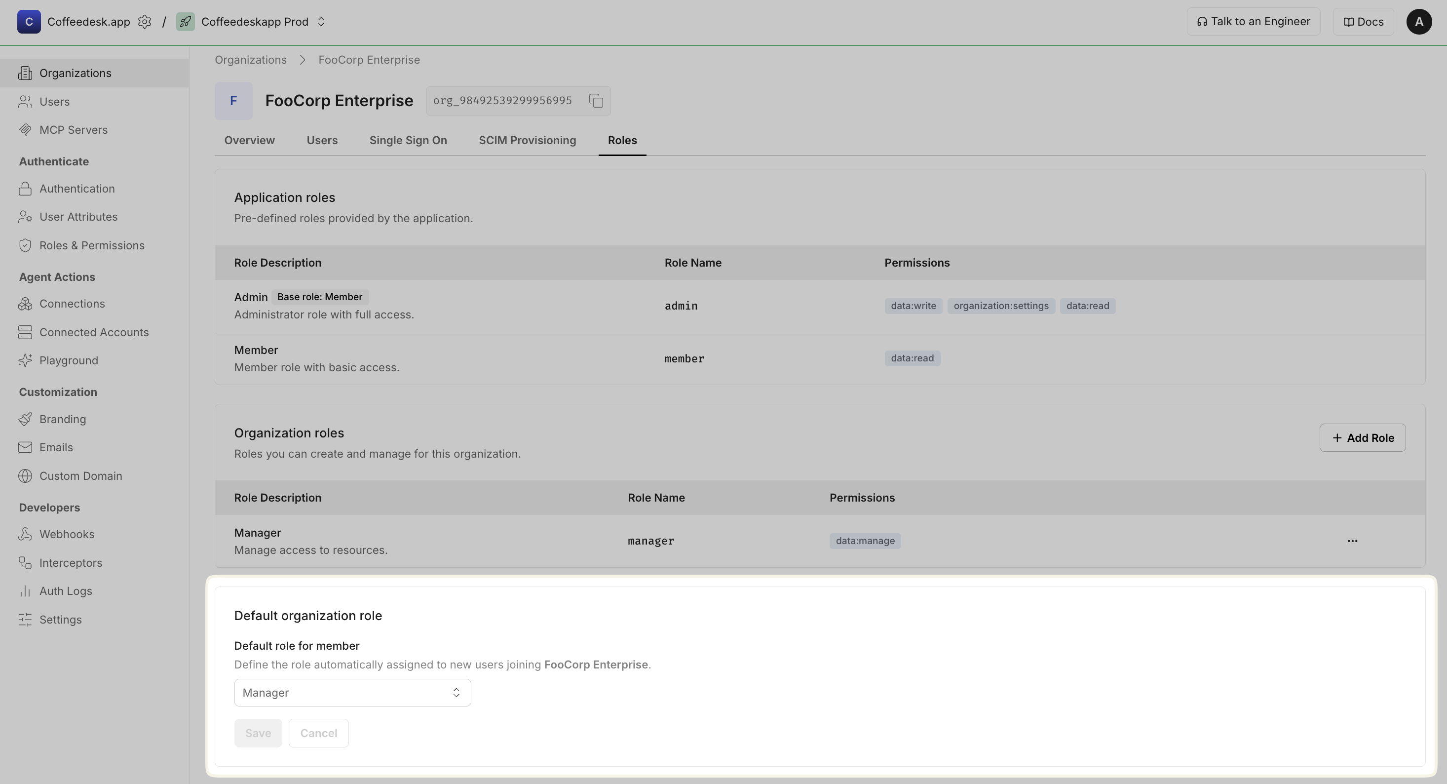 You can also configure a default role that is automatically assigned to users who join a specific organization. This organization-level setting overrides the application-level default role described above, allowing finer-grained control per organization.
