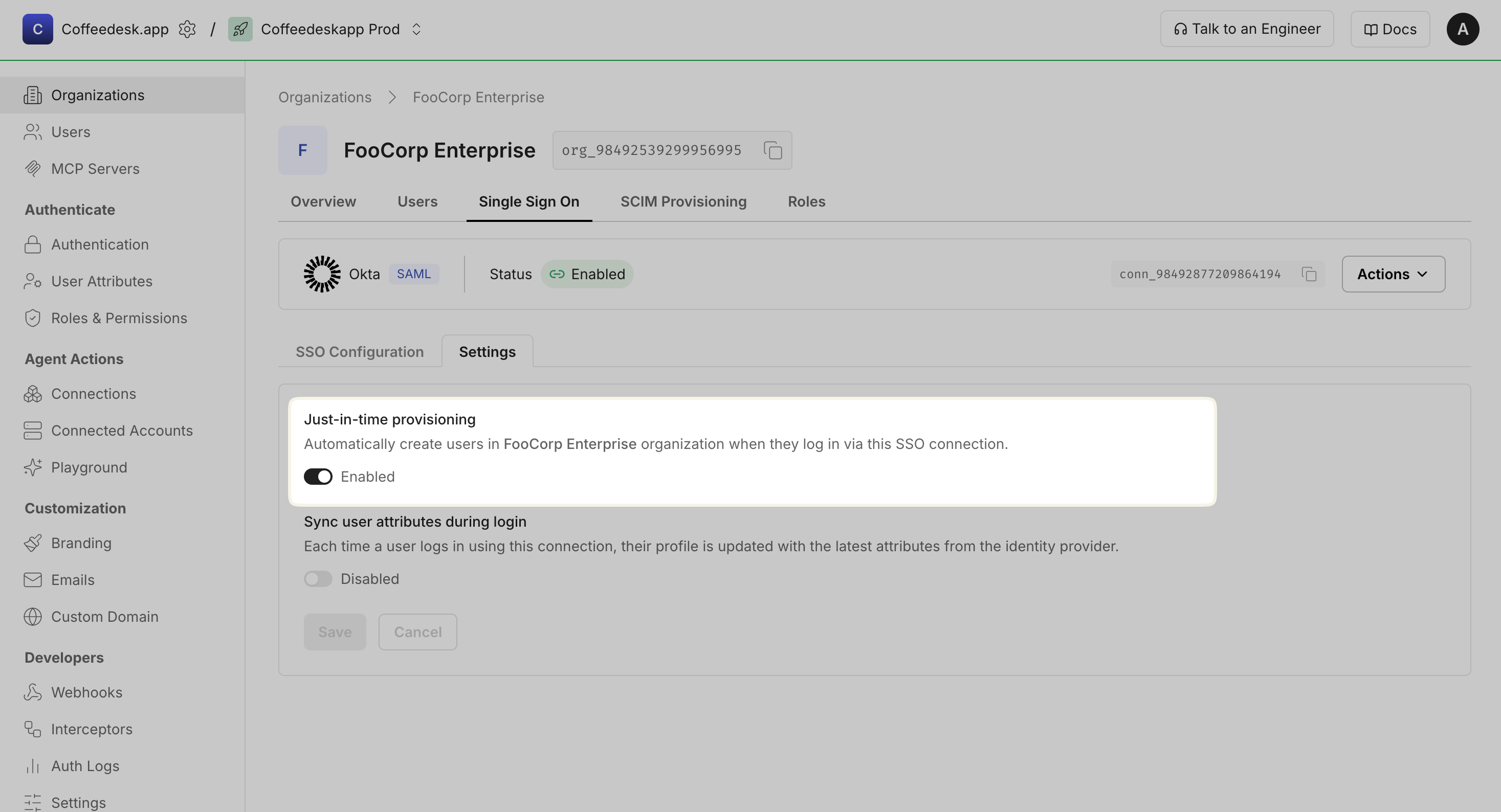Your customers (organization admins) can manage JIT provisioning settings through the Admin Portal, including registering organization-owned domains, toggling JIT provisioning on or off, and keeping user profiles in sync with the identity provider.