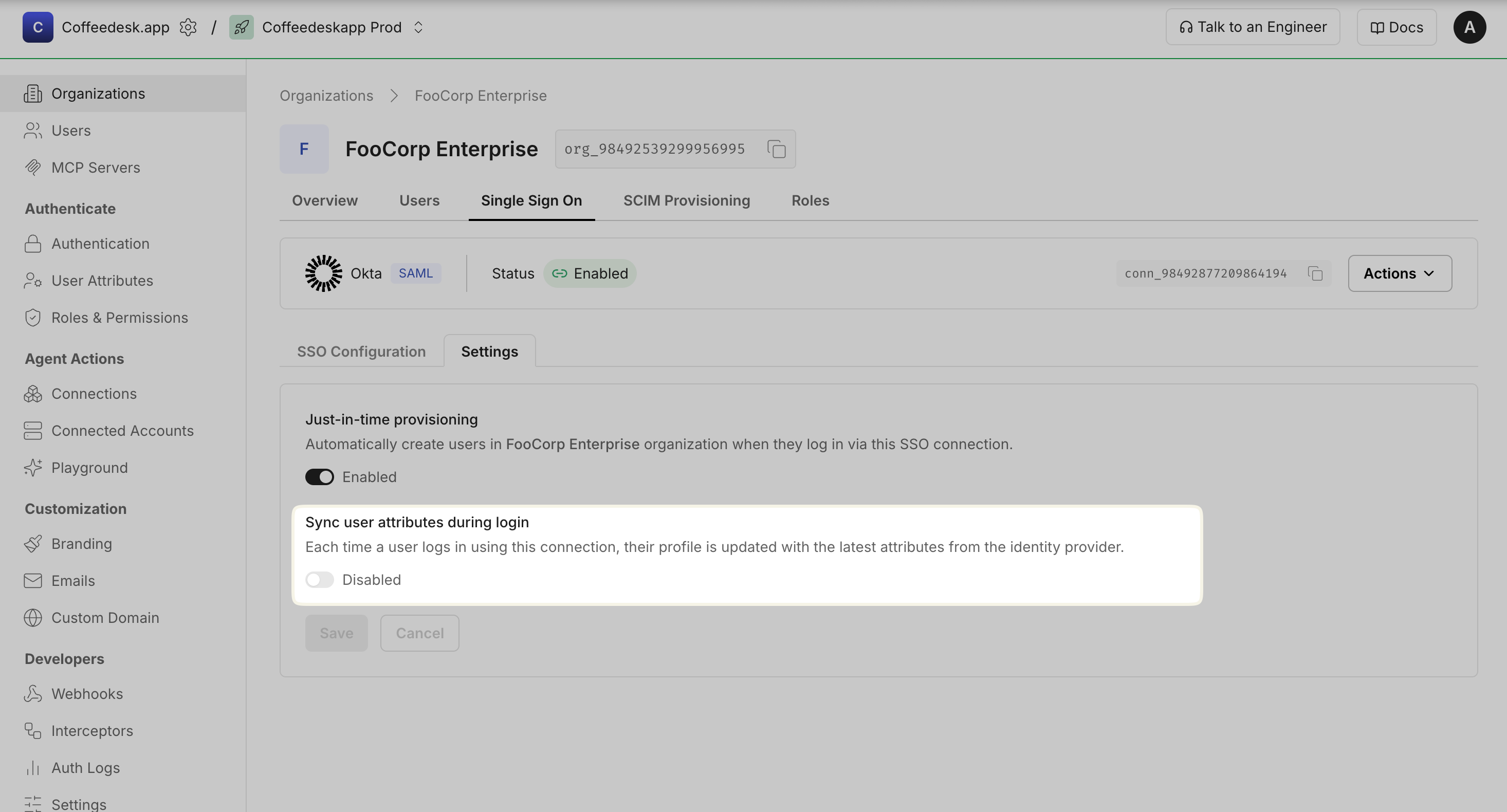 Enable Sync user attributes during login to keep user profiles updated. When enabled, Scalekit updates the user’s profile using attributes from the identity provider each time they authenticate.