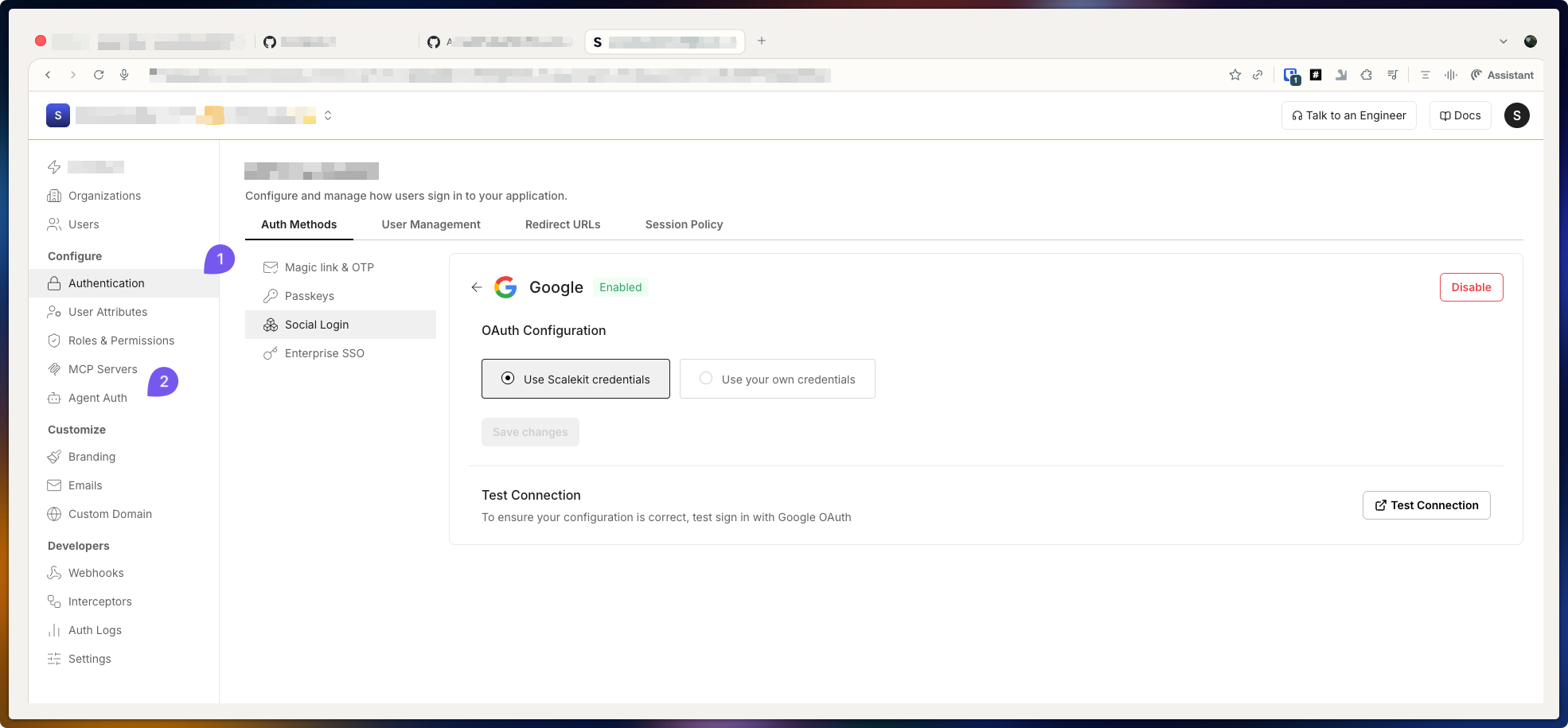 • Open Scalekit Dashboard → Authentication → Auth methods → Social login