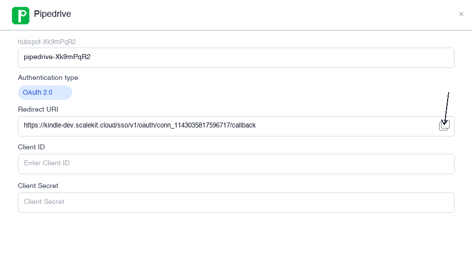 Section titled “Set up the agent connector”Register your Scalekit environment with the Pipedrive connector so Scalekit handles the OAuth flow and token lifecycle on your behalf. The connection name you create is used to identify and invoke the connection in code.