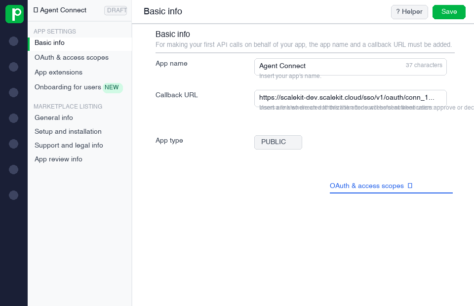 My Sales Agent) - Callback URL — paste the Redirect URI you copied from Scalekit